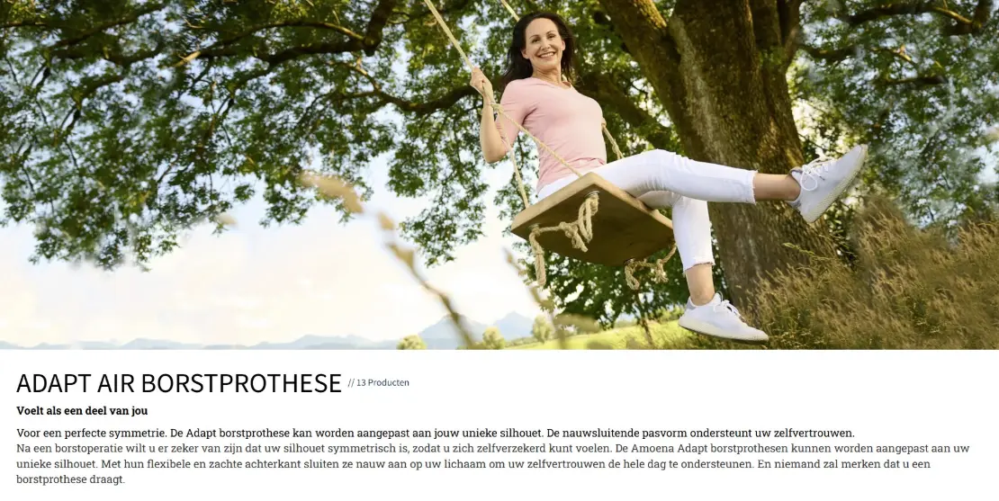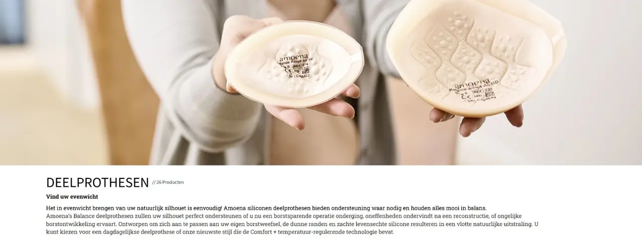 Borstprothesen en shapers van Amoena bestaan in vele vormen, maten en functionaliteiten. Zo zijn er zeer zachte prothesen en shapers voor de gevoelige huid, of met speciale temperatuurregulerende eigenschappen voor dames die veel sporten of zweten, of zelfs onze meest innovatieve prothese en shaper met luchtkamertechnologie die aan het unieke silhouet en de unieke borstwand kan aangepast worden. Met deze producten kan u dus uw symmetrie herstellen na een borstamputatie, borstsparende therapie, borstreconstructie, meerdere biopsieën of ook in het geval van natuurlijke borstasymmetrie. Ons doel is om vrouwen niet alleen hun natuurlijke, vrouwelijke silhouet terug te geven, maar ook hun zelfvertrouwen.