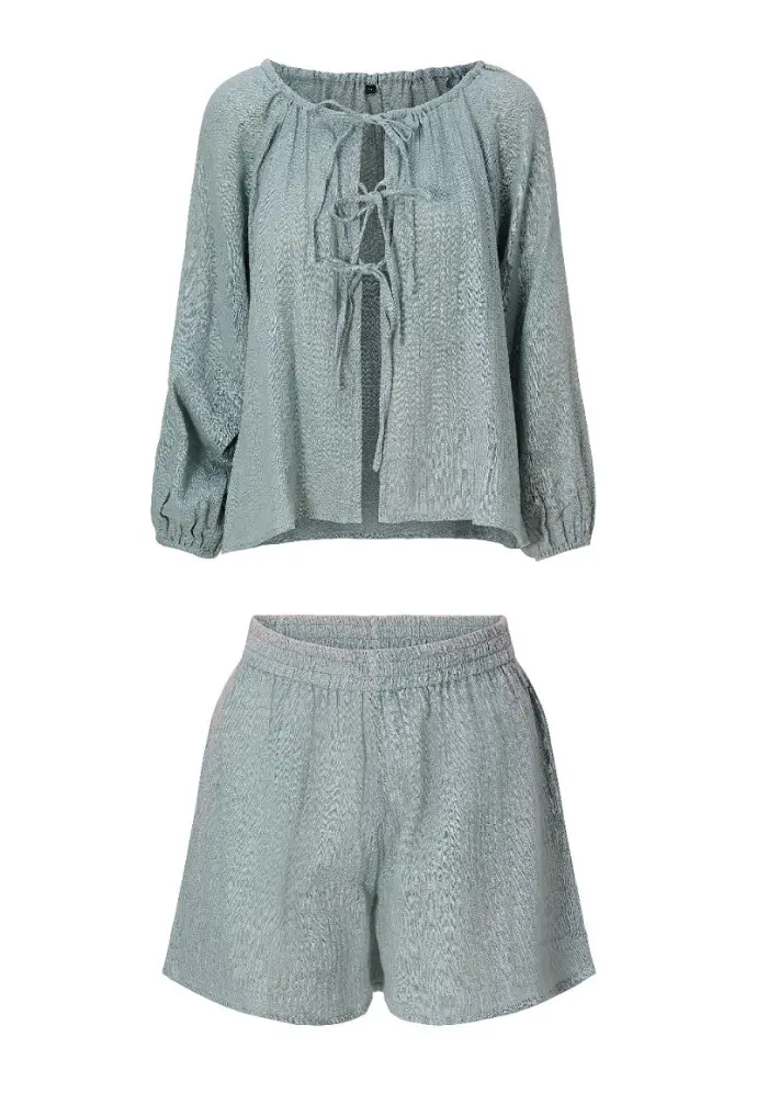 Deze prachtige, katoenen set is een echte eyecatcher. De luchtige set bestaat uit een lange top met strikjes aan de voorkant. De bijbehorende shorts heeft een losse fit en een elastieken boord voor een comfortabele fit.