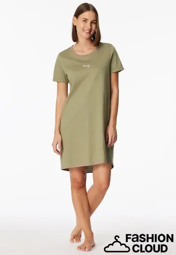 limegroen dames slaapshirt met korte mouwen en "For everyday life" statement print, uit de SCHIESSER "Casual Essentials-serie, met korte, nonchalant omgeslagen armmanchetten, afgeronde zoom, iets lengte op de rug en ronde hals.