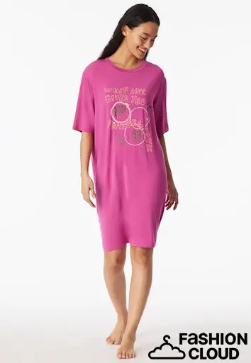 fuchsia dames nachtjapon met trendy granaatappelmotief, uit de SCHIESSER-serie "Casual Fashion, met een groot motief op de voorkant, ronde hals en contrastkleurige kraagband