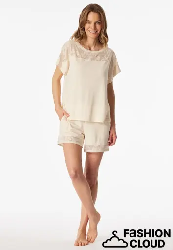 damespyjama in korte parelmoer (crème), uit de SCHIESSER-serie "Modern Allure, moderne, losse snit, Bovenstuk van boxy bovenstuk met ingeweven stof met bloemenpatroon, Broek met effen tailleband, steekzakken en inzetstuk van geweven stof met bloemen aan de broekspijpen,