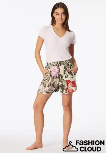 korte damesbroek met veelkleurig, groot, handgetekend bloemenpatroon, uit de populaire SCHIESSER "Mix+ Relax" collectie, moderne pasvorm met wijd, los been , elastische tailleband en zakken aan de zijkant, ideaal om te combineren met andere artikelen uit de Mix+ Relax collectie!