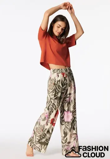 lange damesbroek met meerkleurig, groot, handgetekend bloemenpatroon, uit de populaire SCHIESSER "Mix+ Relax" collectie, moderne pasvorm met wijd, los been en boxplooien, elastische tailleband en zakken aan de zijkant, ideaal om te combineren met andere artikelen uit de Mix+ Relax collectie!